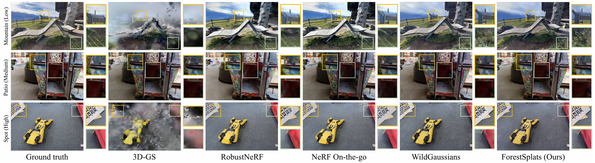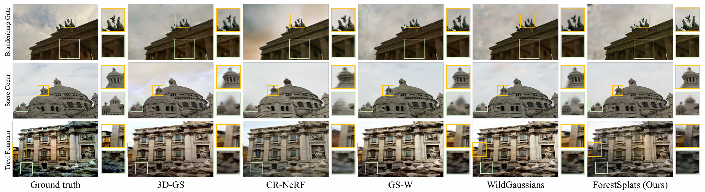 We visualize ForestSplats on the Photo Tourism and NeRF On-the-go datasets. Our method produces high-quality 3D renderings and distractor-free novel view synthesis results.